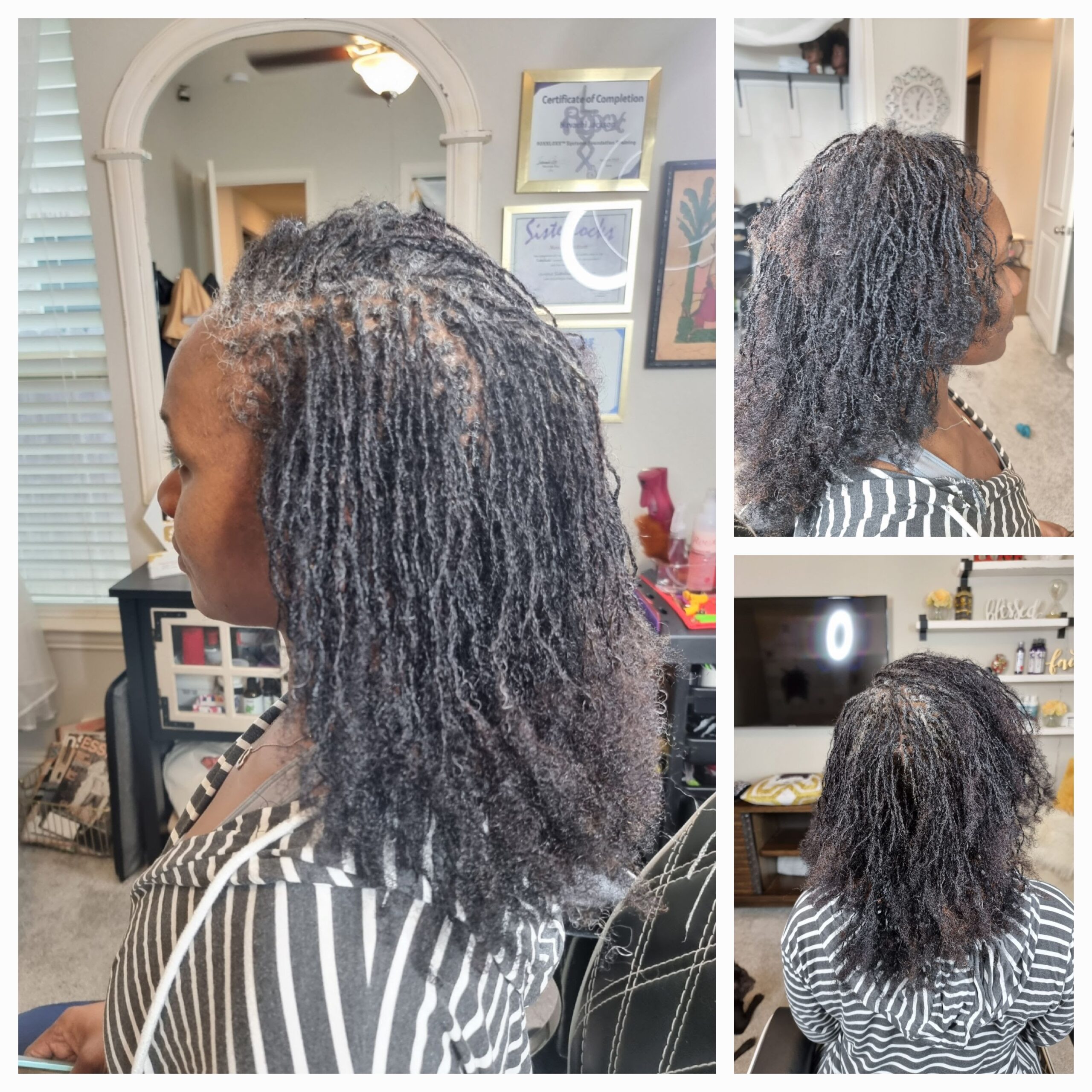 Microlocks/Interlocks are an alternative to Sisterlocks®. They can be started with braids, 2 strand twist, or interlock tech. They generally result in at least 150 to 300 locks. They are large uniformed locks that are installed free formed by grabbing parts or parting hair for more cleaner look.